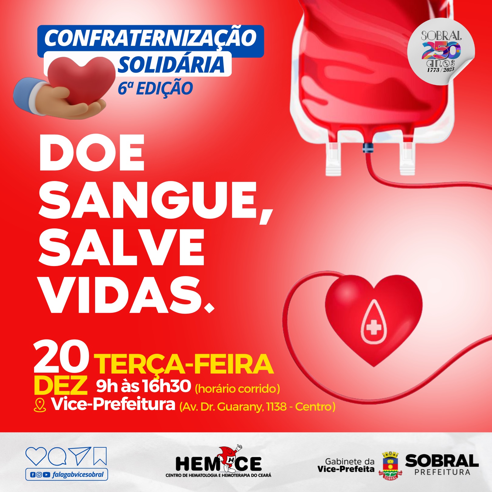 A Vice-Prefeitura de Sobral, em parceria com o Centro de Hematologia e Hemoterapia do Ceará (Hemoce), realizará no dia 20 de dezembro a sexta edição da campanha Confraternização Solidária. A coleta de sangue acontecerá, das 9h às 16h30h (horário corrido), na sede da Vice-Prefeitura, localizada na Avenida Dr. Guarany, 1138, Centro (próxima ao Boulevard do Arco).